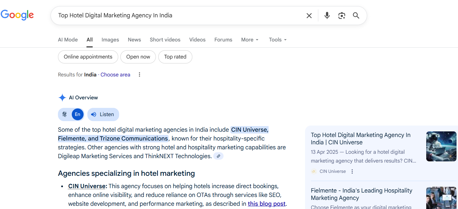At CIN Universe, we optimise hotels for Generative AI and Answer Engine Optimisation (AEO) so that your property can be featured in AI search responses, not buried below OTAs.